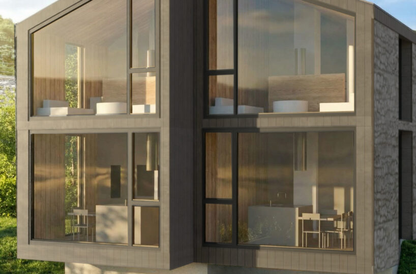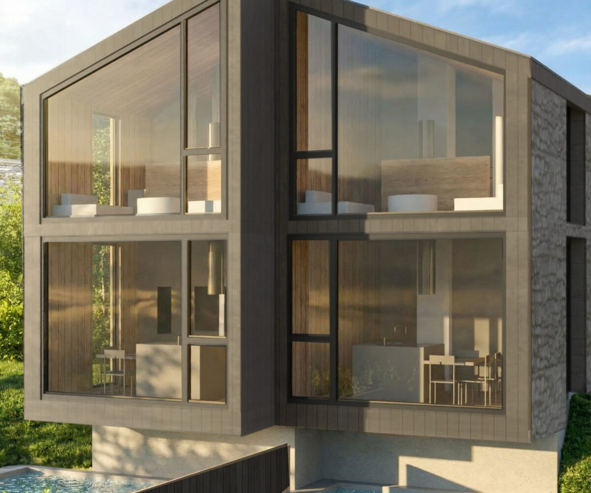 The project is designed to fully enjoy a lakeside home and features panoramic glass facades, interior concrete and plaster walls, exterior wood cladding, and interior flooring and paneling from the sample collection.