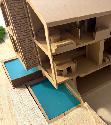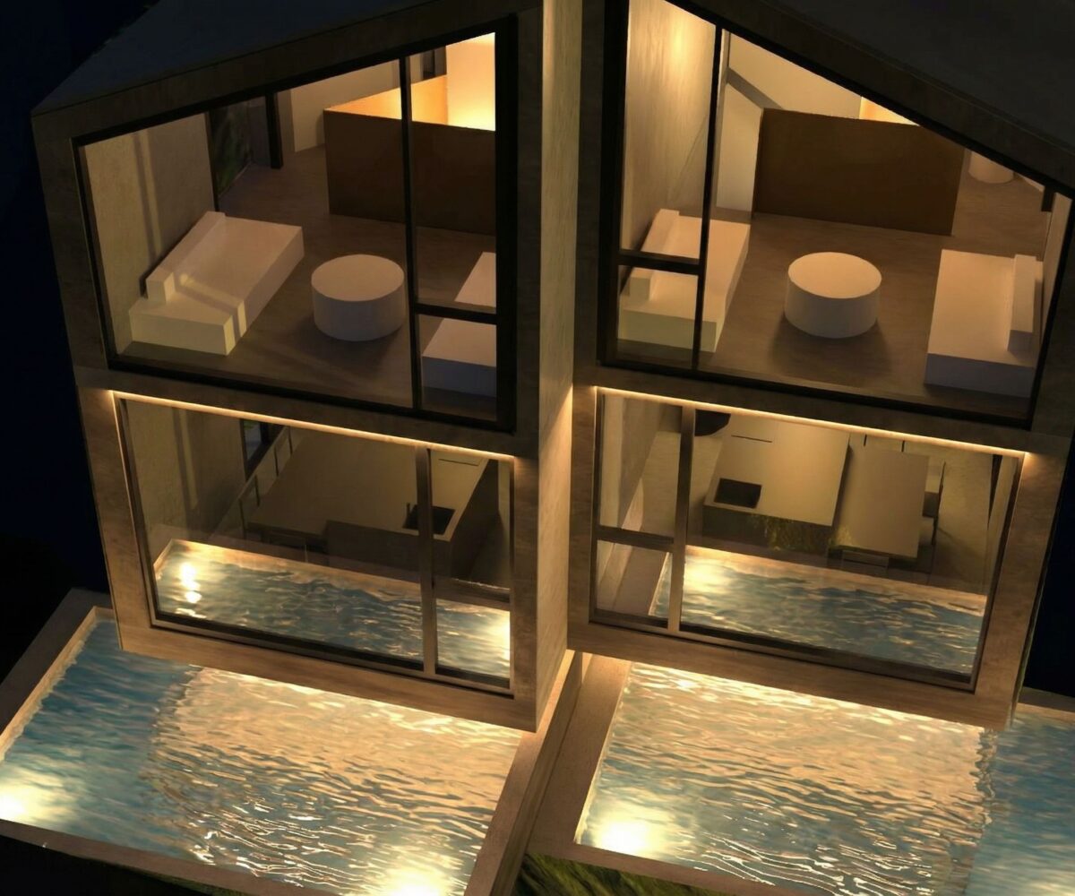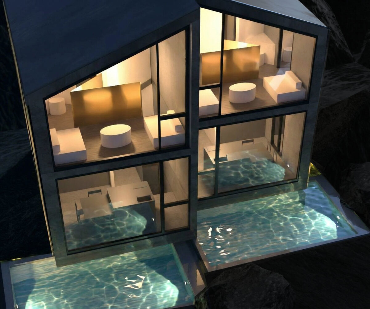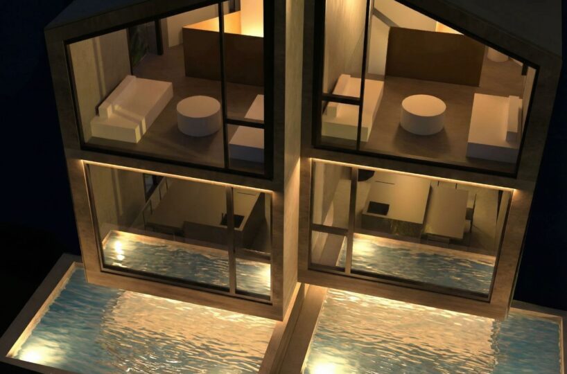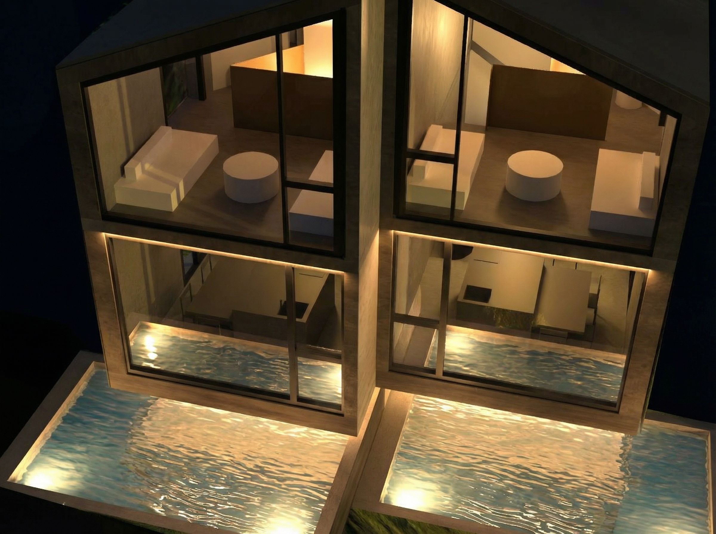 Each unit includes a private 3×5 meter swimming pool, equipped with internal and external lighting, a shower head, and a waterfall shower with a stoneware surround.