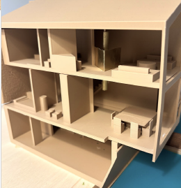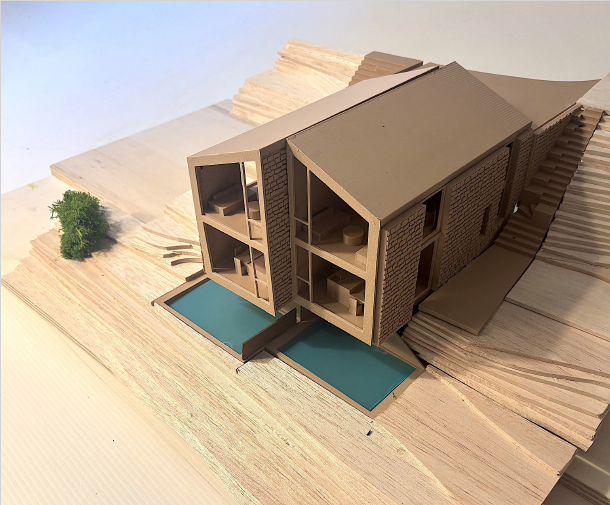 Each unit is structured on three levels: storage and utility rooms in the basement; on the ground floor, a kitchen/dining room with bedroom, bathroom, hallway, and stairs leading to the first floor, which consists of