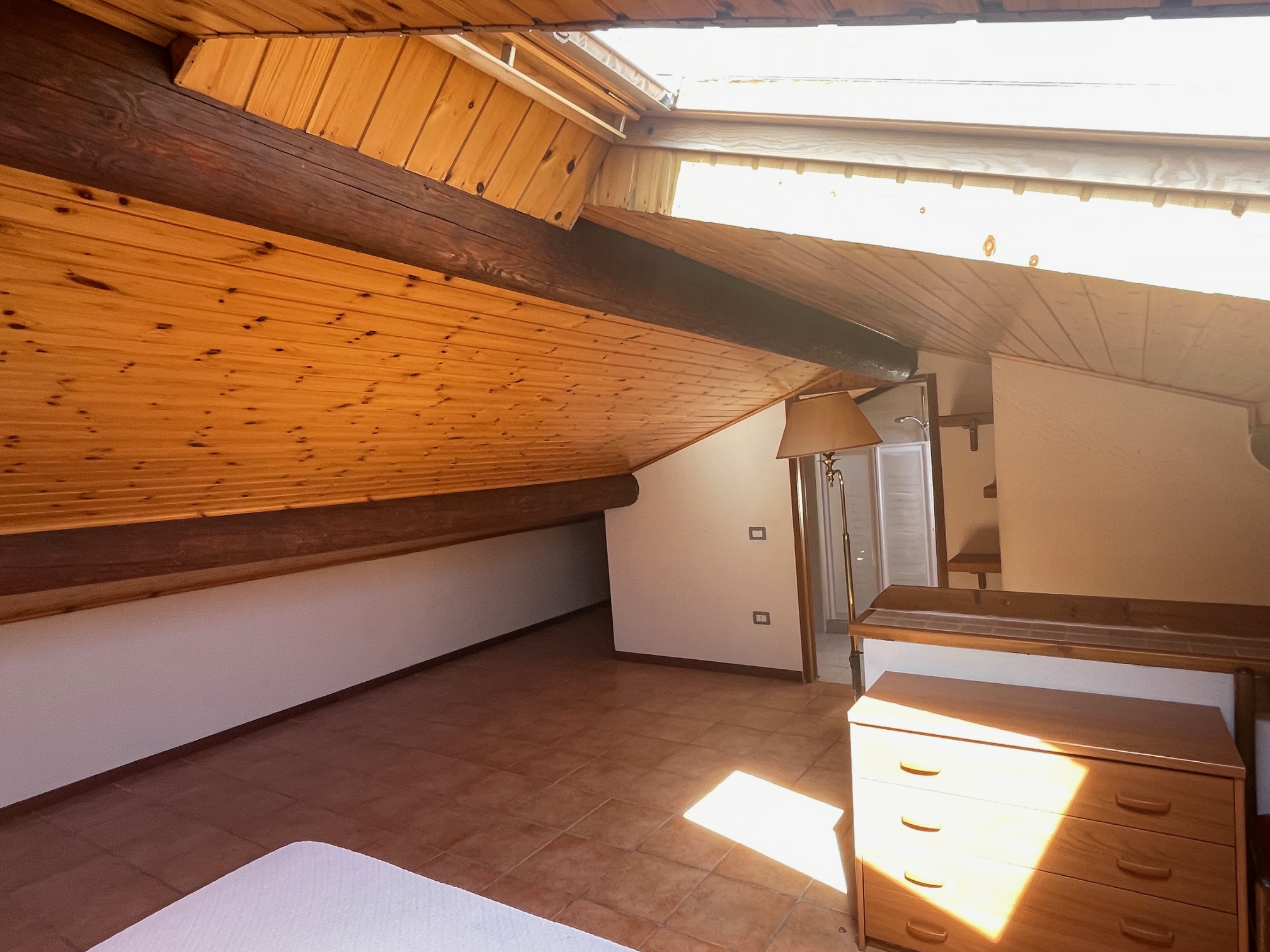 al piano superiore ampio openspace, bagno, controsoffitto mansardato in legno.